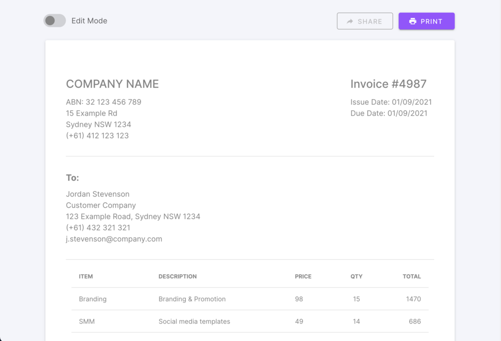 The best thing about this invoice generator is that you can share invoices with your clients via a link straight on your website.